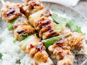 The yakitori chicken includes green shallots, chicken thigh cut into bite-size pieces, and teriyaki sauce, all grilled on skewers, and is served with rice.