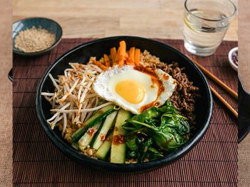 Bibimbap is a Korean rice dish. It is served on a bowl of warm white rice topped with gochujang, soy sauce, or doenjang. Additions can be made, such as a raw or fried egg, and sliced meat. The hot dish is stirred together thoroughly just before eating.